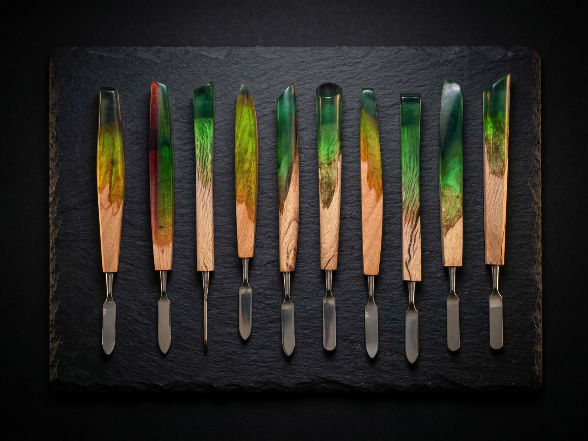 Each piece is handcrafted with meticulous attention to detail, where natural wood merges with crystal-clear resin, creating a unique pattern in every tool.