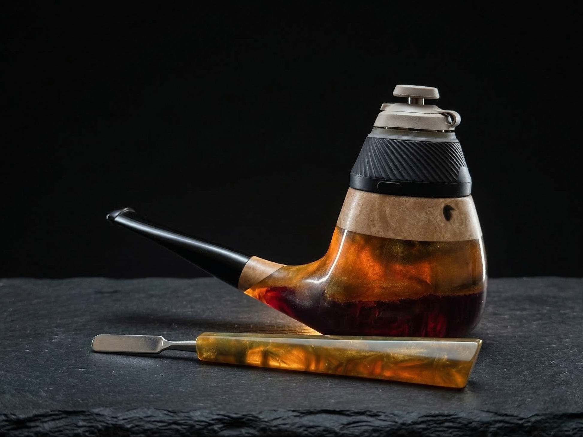 Golden Flame is a masterpiece decorative pipe crafted by skilled artisans with decades of expertise. This unique piece is made from highly prized ancient northern hardwood, sourced from forests that once stood as witnesses to harsh natural conditions and human exploration. The material comes from centuries-old timber, whose radiant grain and texture leave a breathtaking impression.